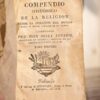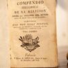 Publicado: Valencia: Oficina de Estevan, 1818 Autor: PINTON Josef. Título: Compendio histórico de la religión. 2 TOMOS. Encuadernación: Encuadernación de tapa dura Estado: Muy bien Información adicional: 8vo. I: VIII pp. + 386 pp. II: 355 pp. Pergamino de época, rótulo en lomo desvaído pero legible. Completo y en buen estado.